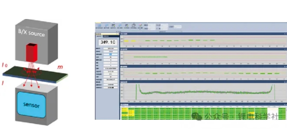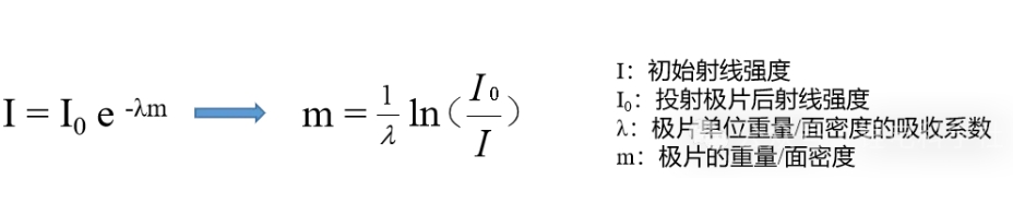 ①X/β-ray测量原理:射线作用于正负极片,射线会被极片吸收,反射,散射,从而导致投射极片的射线强度相对入射射线强度有一定的衰减,其衰减比例与极片的重量/面密度成负指数关系(无损检测)