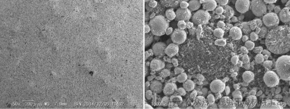 左图带有气泡的负极片、右图扫描电镜200倍放大图。在合浆、转运和涂布过程中,粉尘或长度较大的毛絮物等异物混入涂布液中或落到湿涂层表面,该处涂层表面张力因受外力影响导致分子间作用力发生改变,浆料发生轻度转移,经烘干后形成圆形痕迹,中间偏薄。