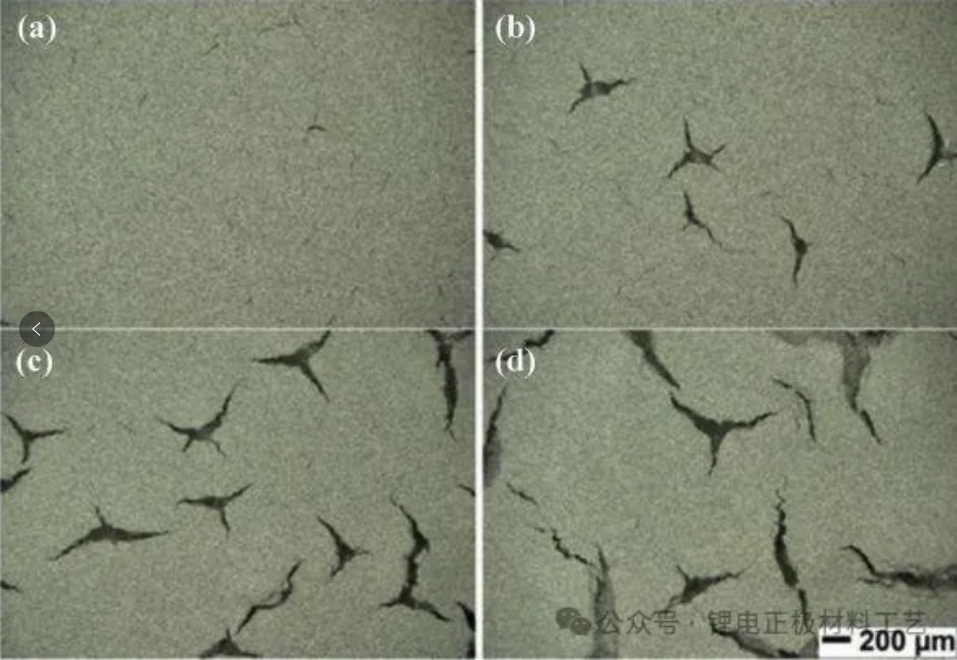 配方:NMC532/carbon black/binder= 90/5/5 wt%, 水/异丙醇(IPA)溶剂;极片表面裂纹光学照片,涂布面密度分别为 (a) 15 mg/cm2,(b)17.5 mg/cm2, (c) 20 mg/cm2和(d) 25 mg/cm2,厚极片更容易出现裂纹。
