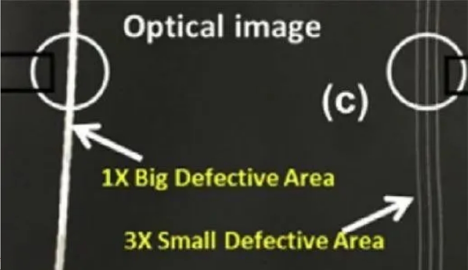 负极暗痕,1.暗痕宽厚,造成过压析锂;2.暗痕窄浅,表现为色差,风险低;