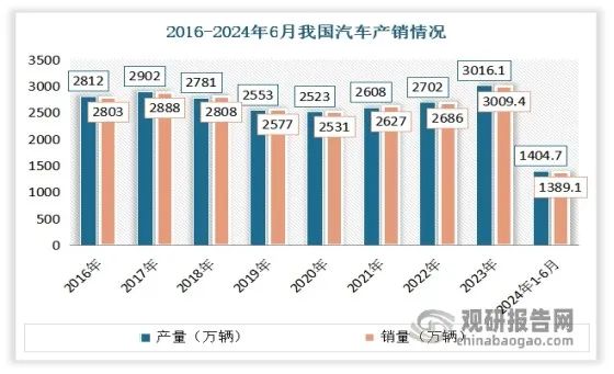 根据中国汽车工业协会的数据显示,2023年我国汽车产销累计完成3016.1万辆和3009.4万辆,同比别增长11.6%和12%,产销量创历史新高,实现两位数较高增长。2024年1-6月,我国汽车产销分别完成1389.1万辆和1404.7万辆,同比分别增长4.9%和6.1%。