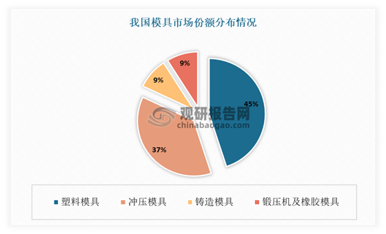 从细分市场来看,塑料模具、冲压模具、铸造模具、锻压机及橡胶模具是当前我国主要市场的主流产品。其中塑料模具占比最大,占比45%;其次为冲压模具,市场占比37%。