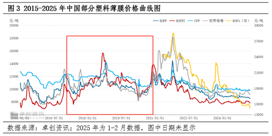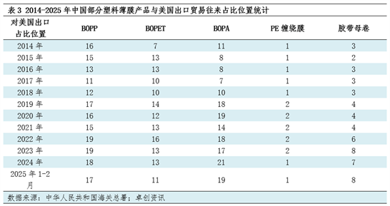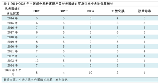 从中国塑料薄膜进口贸易伙伴角度梳理,美国位于相对靠前的位置,据中华人民共和国海关总署数据,卓创资讯统计整理,美国在中国主要塑料薄膜产品中进口贸易伙伴的位置大多在第5位前后水平,在被梳理的5个主要产品中,除BOPP产品从美国进口量占比在第5位及靠后的位置外,其他四个产品多数时间均处于第5位及靠前水平,2025年1-2月多数塑料薄膜产品基本延续过去十年的贸易地位,仅BOPA变动较大,从美国进口量急剧减少,综合来看 午夜电影院网站,从中国塑料薄膜进口来源上讲,美国为较为重要的贸易伙伴之一。