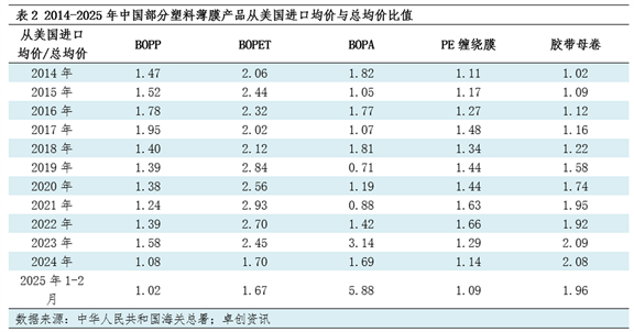 中国塑料薄膜从美国进口商品均价偏高,部分以高端品为主。据中华人民共和国海关总署数据、卓创资讯统计整理,中国主要塑料薄膜产品从美国进口均价较总均价偏高,多数在1 午夜电影院在线,5-2倍,个别略低(不足1倍)、偏高(3倍左右)的情况存在。在被梳理的5个主要产品中,从美国进口商品成本溢价比例排序为BOPET>胶带母卷>BOPA>BOPP>PE缠绕膜。2025年1-2月中国从美国进口BOPA的价格出现明显变化,贸易量上也已有同步缩量表现。。