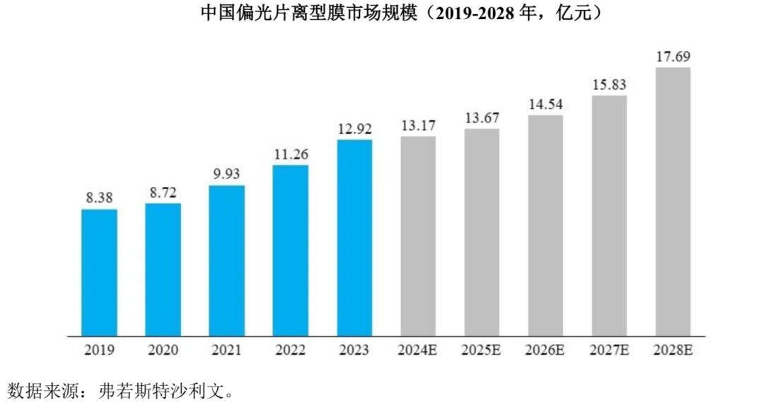 根据弗若斯特沙利文数据显示,2023 年中国偏光片离型膜市场规模约为 12.92 亿元,到 2028 年,中国偏光片离型膜市场预计达到 17.69 亿元,复合年均增长率达 6.48%。整体来看,中国偏光片离型膜市场将在未来几年保持强劲的增长态势。