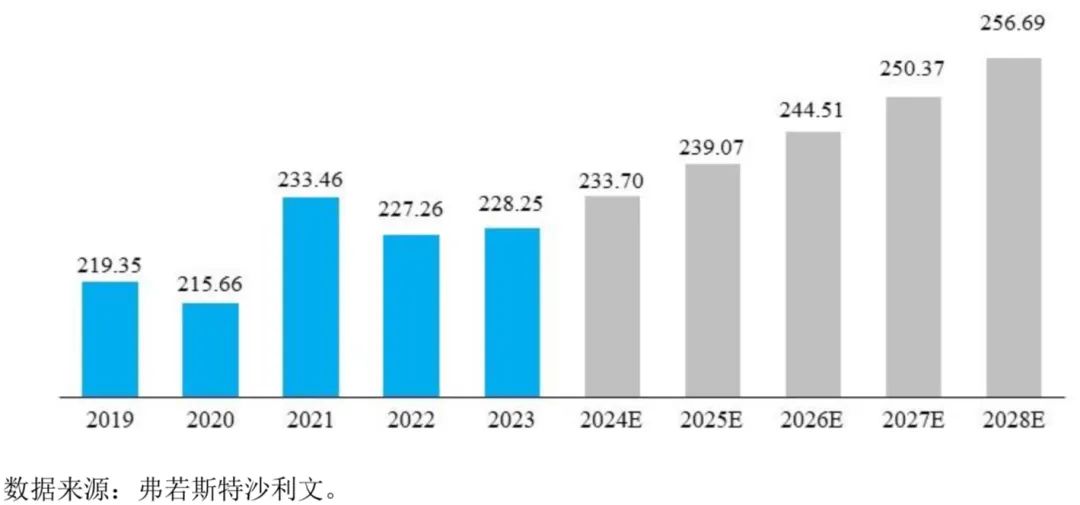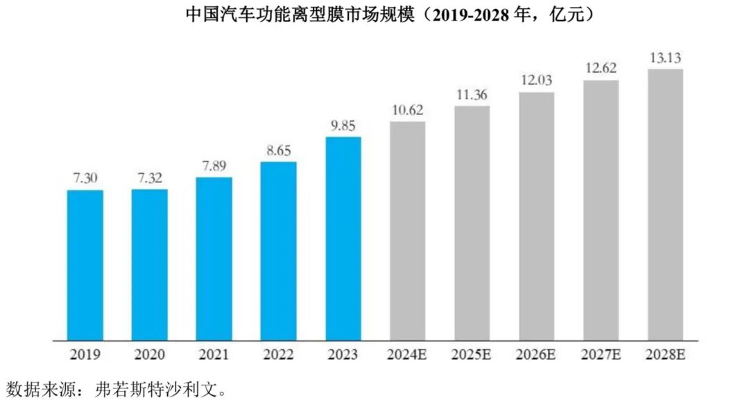 根据弗若斯特沙利文的数据,得益于中国乘用车的快速增长,中国汽车功能离型膜市场规模由 2019 年的 7.30 亿元增长至 2023 年的 9.85 亿元,复合增长率达 7.78%。随着新能源车的销量及渗透率逐渐增加,预计 2028 年中国汽车功能离型膜市场规模将达 13.13 亿元。