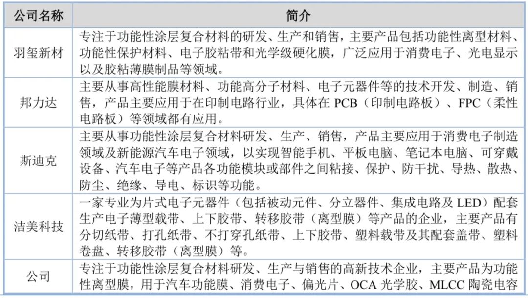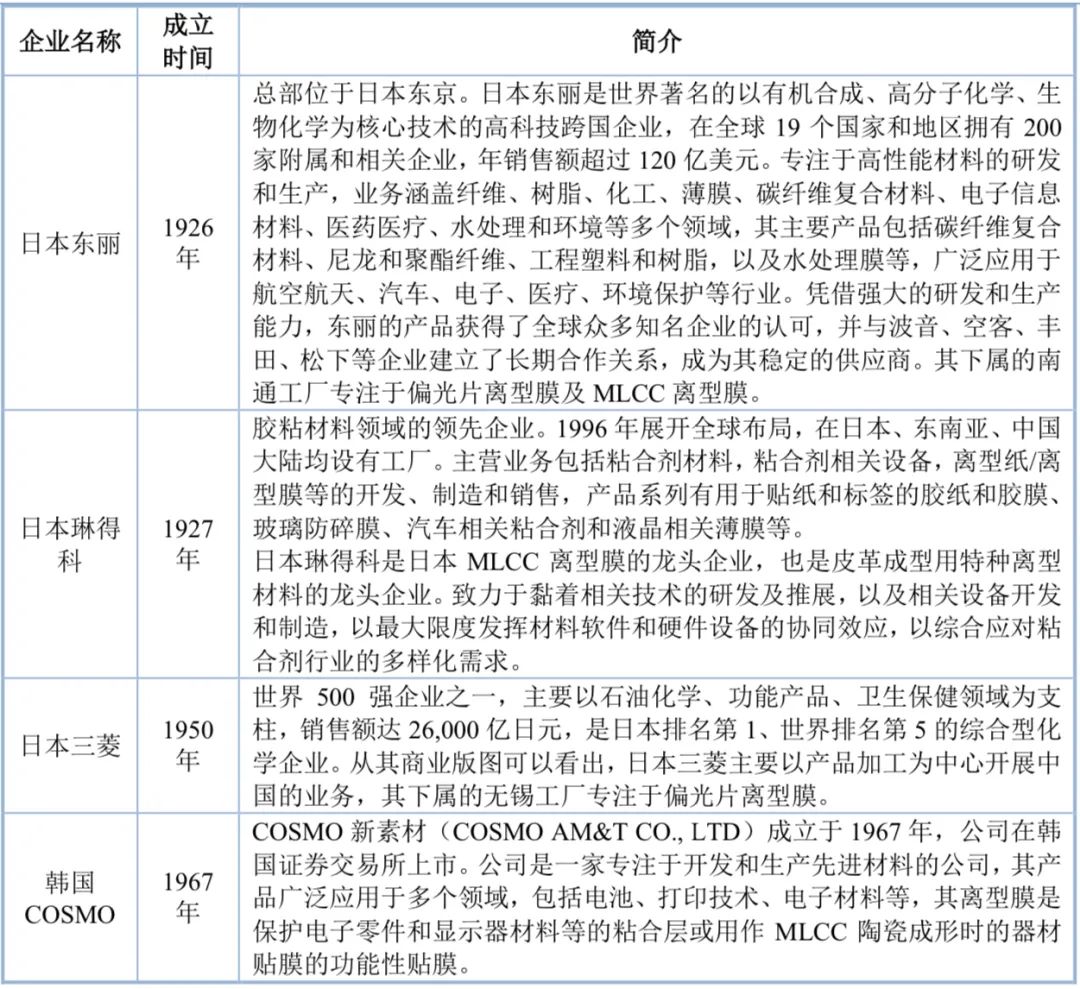 从全球范围来看,功能性离型膜行业中,部分国际知名企业集团历史悠久、行业经验丰富,其研发生产等技术水平先进、产品种类齐全、销售网络成熟、品牌认可度高、拥有稳定的客户群体,少数企业基本垄断了偏光片、MLCC、OCA 光学胶等行业使用的功能性离型膜中高端市场,并引领行业的发展方向。全球代表企业主要为日本东丽、日本琳得科、日本三菱、韩国 COSMO 等。
