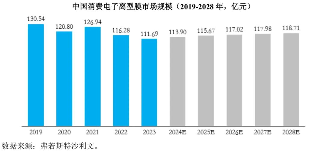根据弗若斯特沙利文数据显示,2023 年,中国消费电子离型膜市场规模达 111.69 亿元。预计未来平板电脑的出货量及新能源车的销量持续上涨,以及其他新兴应用的功能性器件用量需求增加,将带动中国消费电子离型膜市场规模稳步增加,预计 2028 年中国消费电子离型膜市场规模达 118.71 亿元。