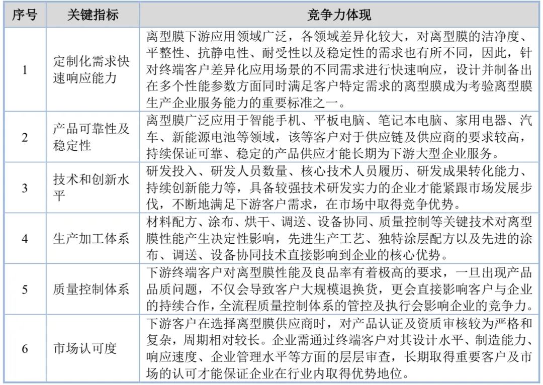 衡量离型膜行业企业核心竞争力的关键指标如下: