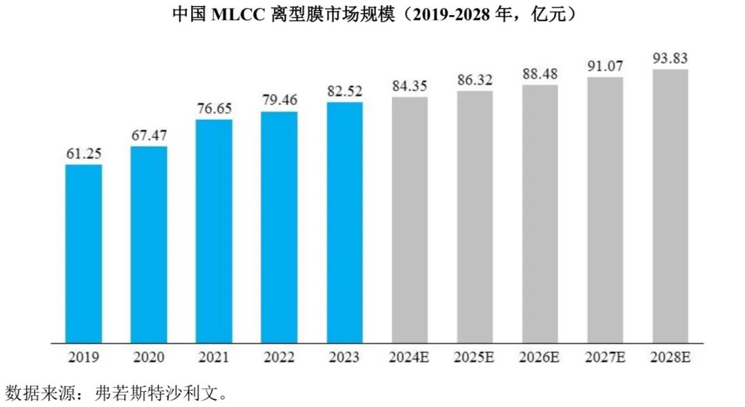 随着生产技术的日益精进,MLCC 的可靠性与集成度不断提高,当前 MLCC 已然成为全球用量最大、发展最快的片式电子元件品种之一。根据弗若斯特沙利文数据显示,受益于消费电子、汽车等下游应用的驱动,MLCC 离型膜市场规模由 2019 年的 61.25 亿元增长至 2023 年的 82.52亿元,复合年均增长率达 7.74%。未来,下游需求的持续扩容将持续驱动市场增长,预计至 2028 年中国 MLCC 离型膜市场规模将增长至 93.83 亿元。