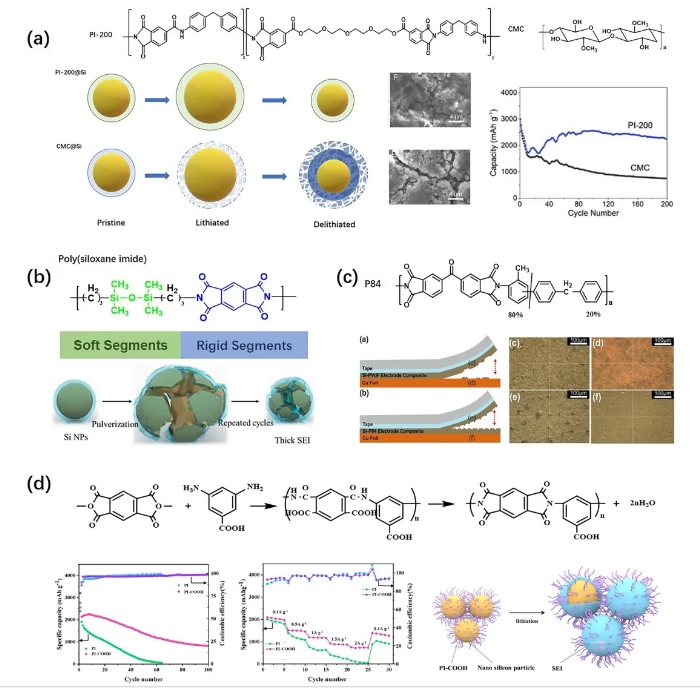 图: a PEG-200、偏苯三酸酐氯化物(TMAC)和4,4’-二氨基二苯醚(MDA)聚合得到PI粘结剂与CMC粘结剂的结构示意图,循环过程中体积膨胀的示意图,循环性能曲线及循环后极片的SEM照片;b 软硬段共嵌的PI粘结剂;c P84 vs PVDF粘结剂的剥离效果示意图;d PI-COOH粘结剂的结构、电化学性能及SEI形成机理。