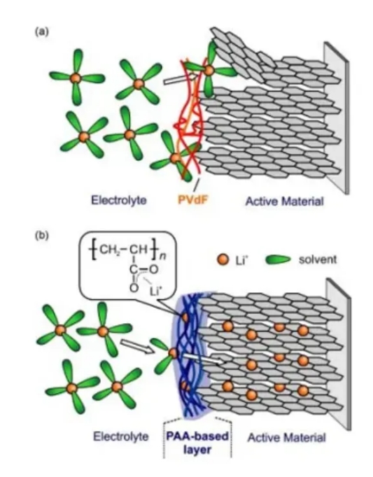 (a) PVDF对锂离子流通的阻碍及其对活性材料结构的影响